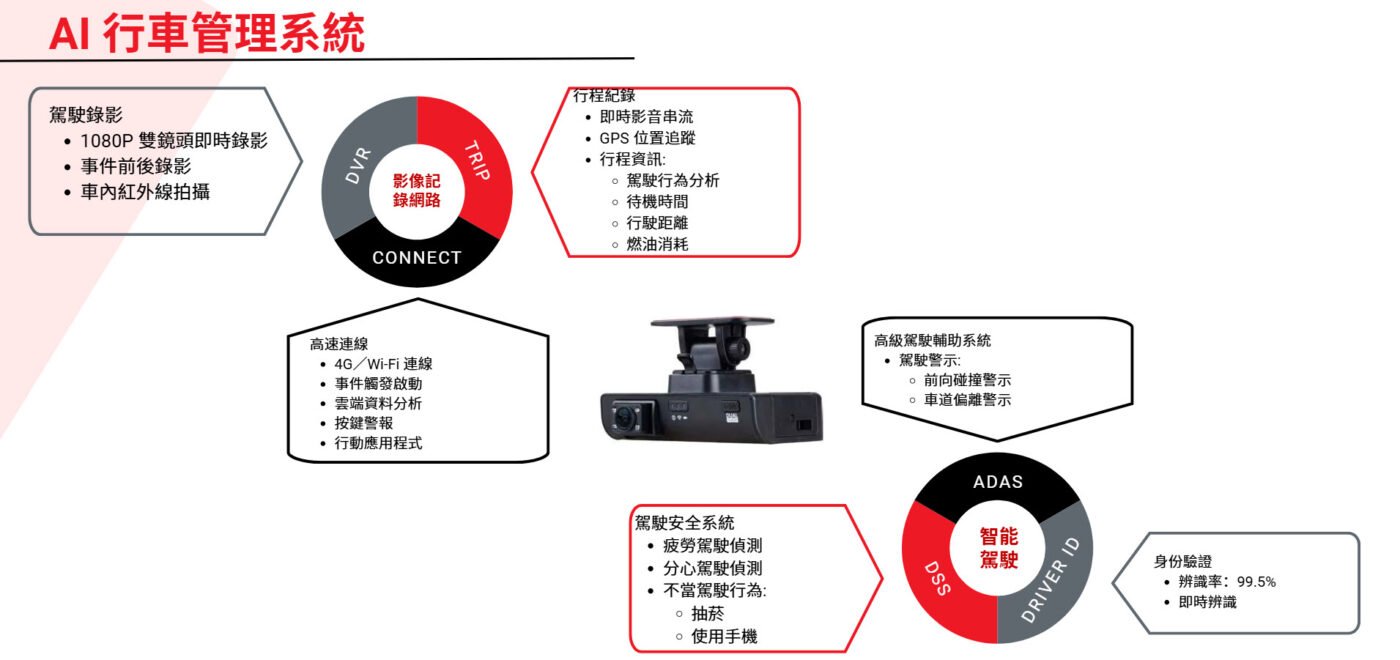 車隊管理解決方案 (客運、貨運等) 此解決方案為結合軟體系統與安裝於運輸工具上的 AI 攝影機之車載裝置,用於收集資訊、監控狀態並警示危險情況,協助駕駛安全操作、降低事故發生。同時,也讓運輸管理單位能取得必要數據,以便監管與調度。